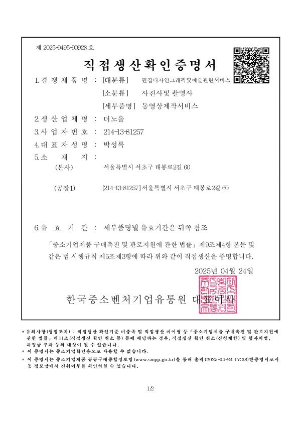 직접생산확인서 직접생산확인서 페이지 정보 작성자 최고관리자 댓글 0건 조회 63회 작성일 25-05-15 20:47 목록 본문 2025 이전글드론4종교육이수증 25.05.15 다음글중소기업확인서 25.05.15 댓글 0 댓글목록 등록된 댓글이 없습니다.